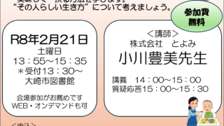 日時:2月21日(土)13:55~15:35講師:株式会社とよみ 小川豊美先生会場:大崎市図書館1階多目的ホール、オンライン、オンデマンド
